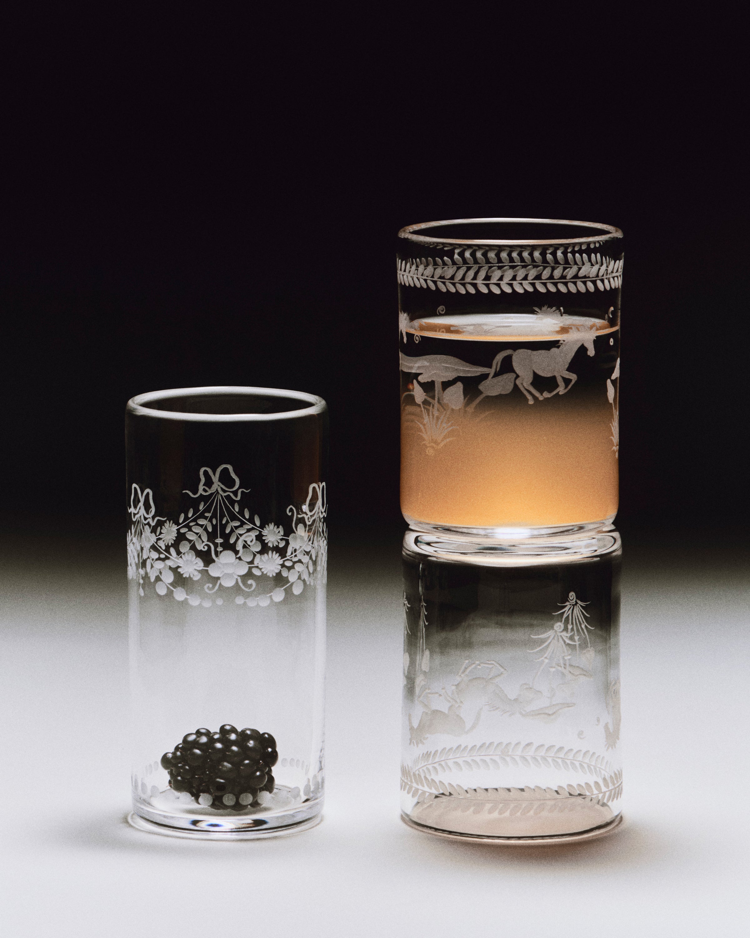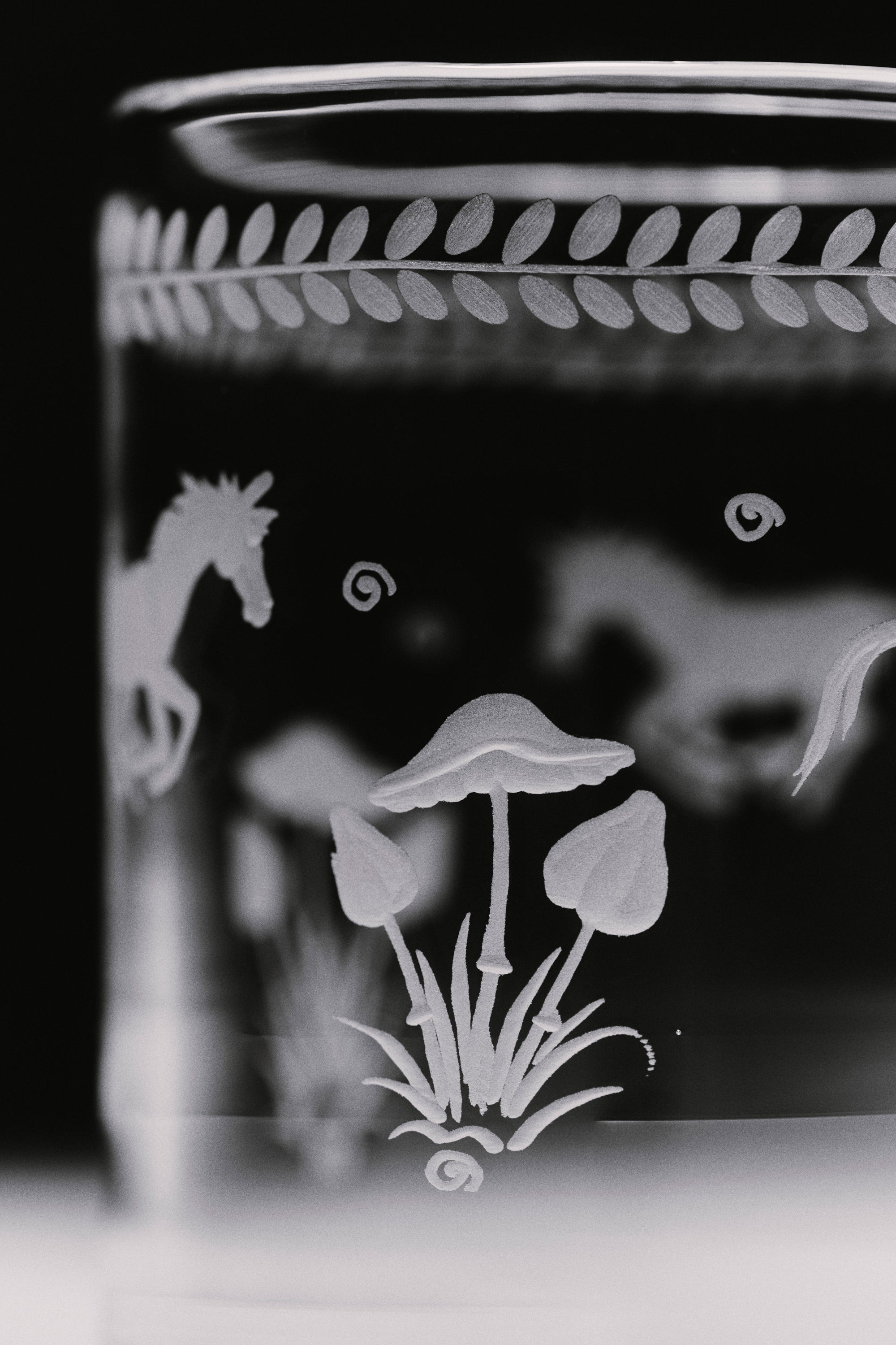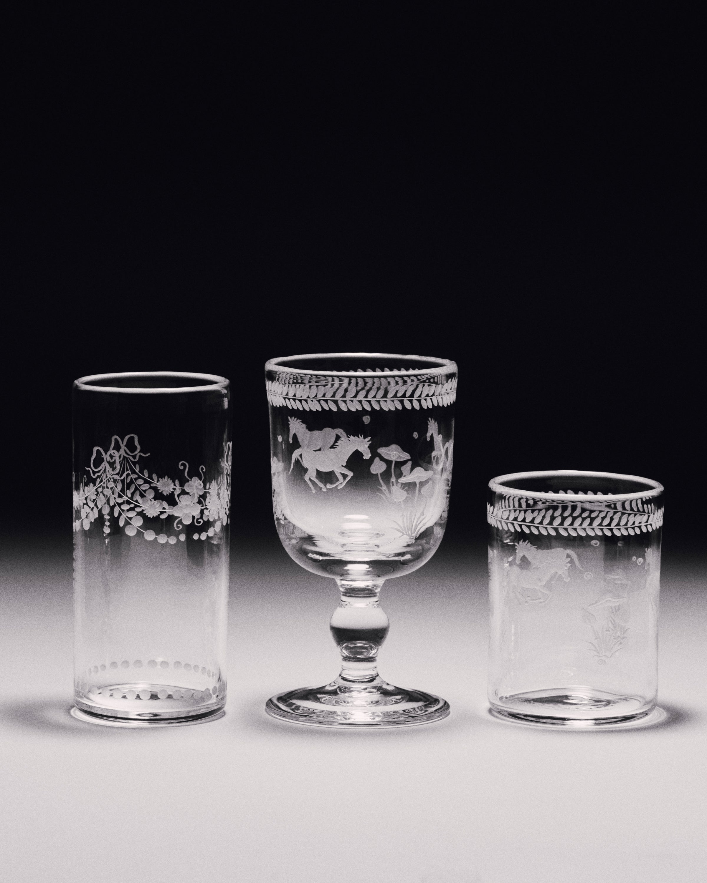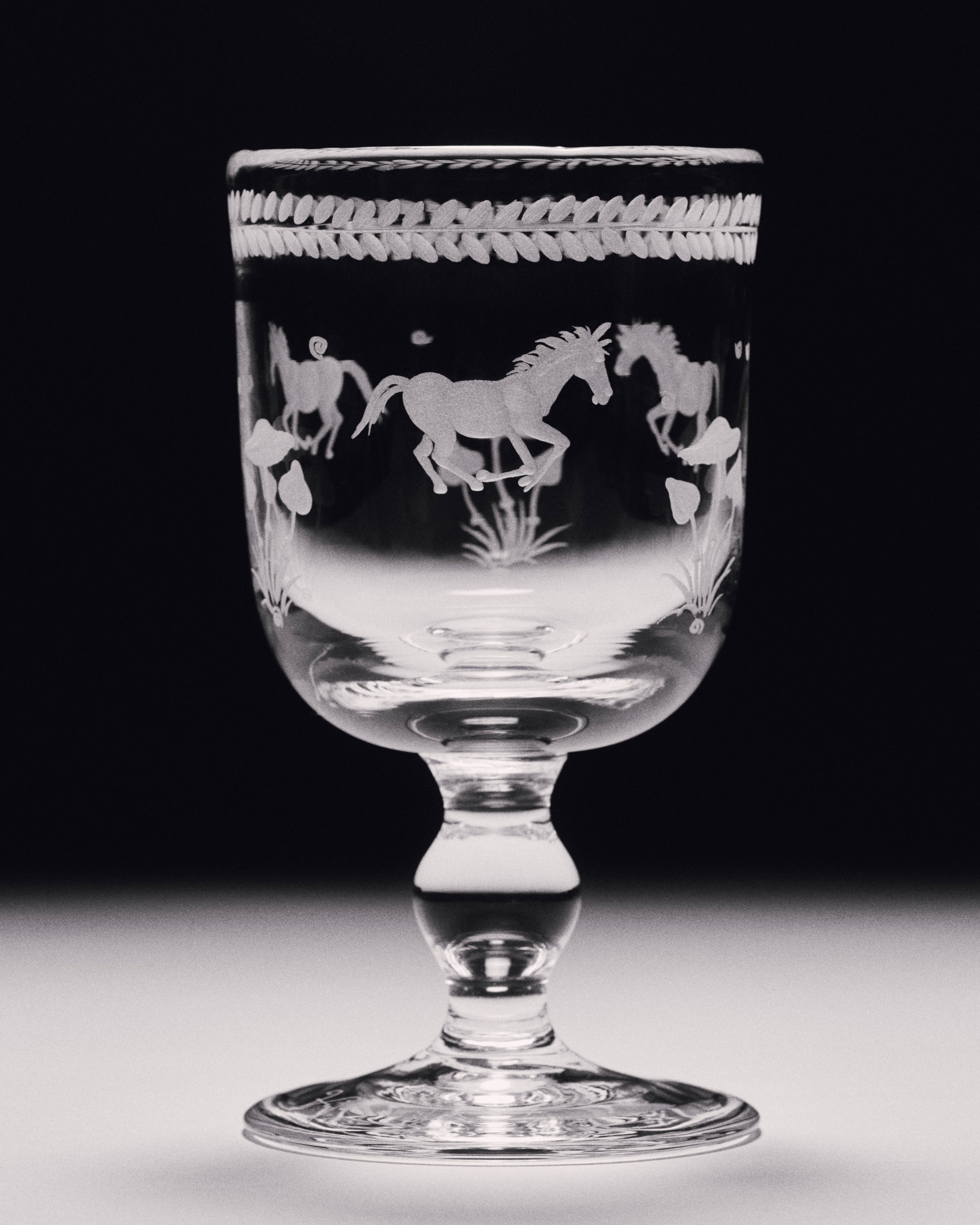 The Barbro glasses celebrate the elegance of the classical souvenir glass while embracing a contemporary design with a squared cup and sculptural stem. Each piece is patiently engraved by the hand of a master, possessing its own poetic character. The motifs are hand-sketched by Akua Objects, reflecting their design philosophy. The bow motif symbolizes unity, enriched with Art Deco inspired engravings, while the playful depictions of mushroom, flowers and horses celebrate the beauty of nature, the freedom of galloping and Annika's horse-filled childhood.