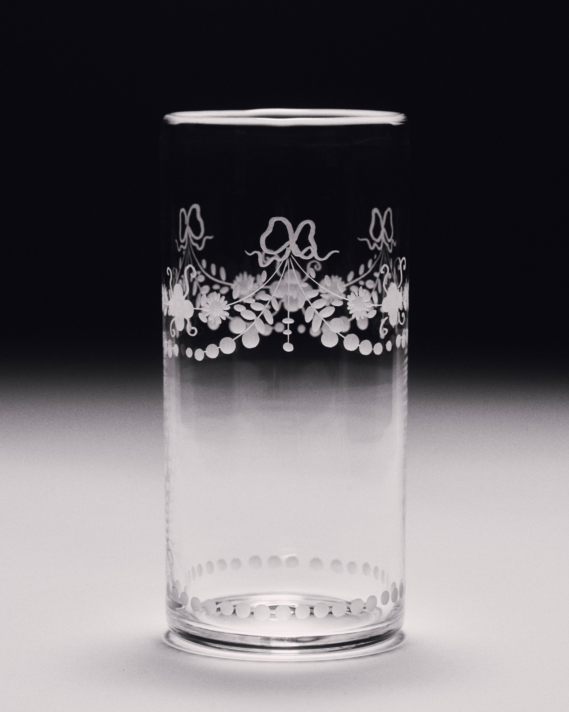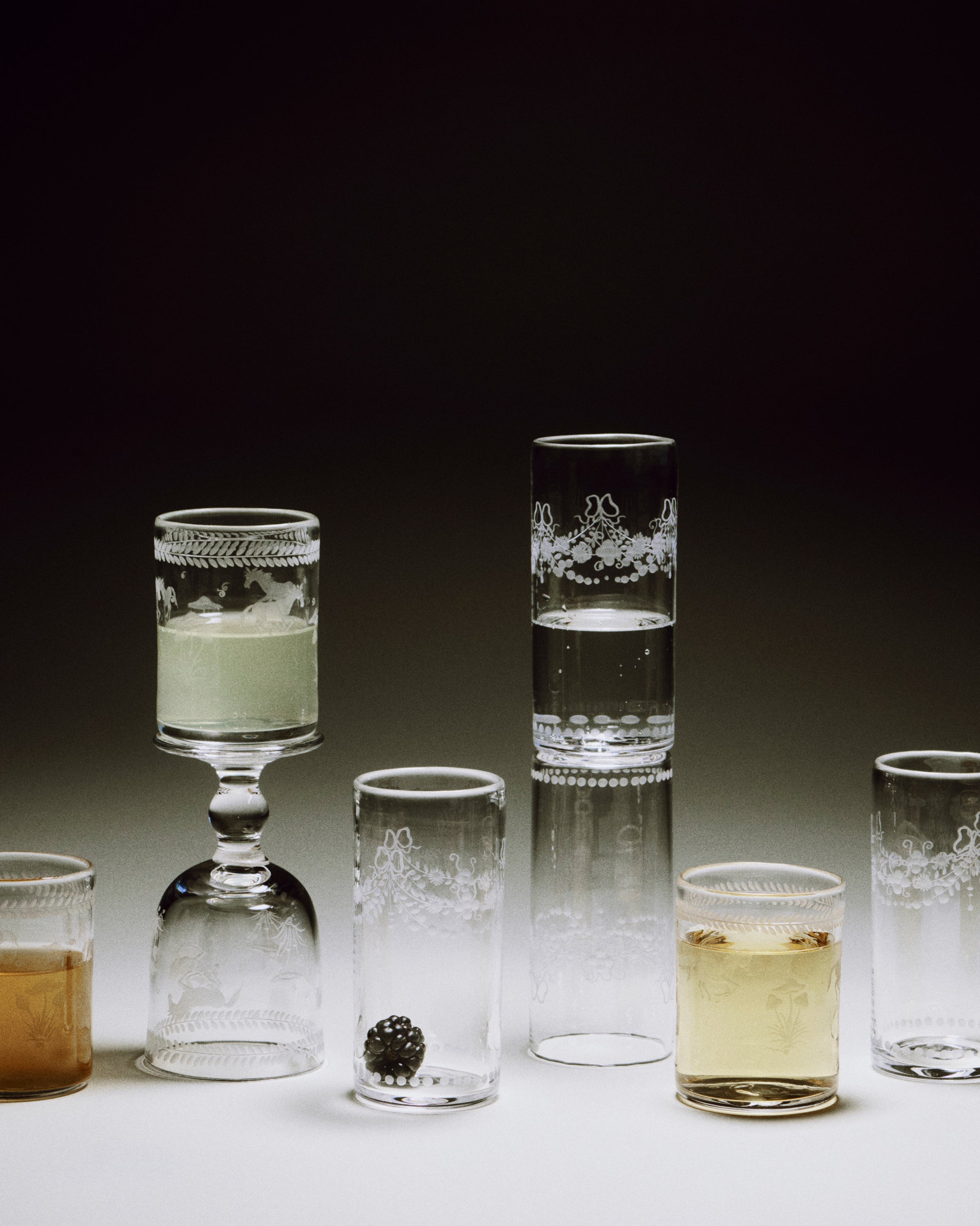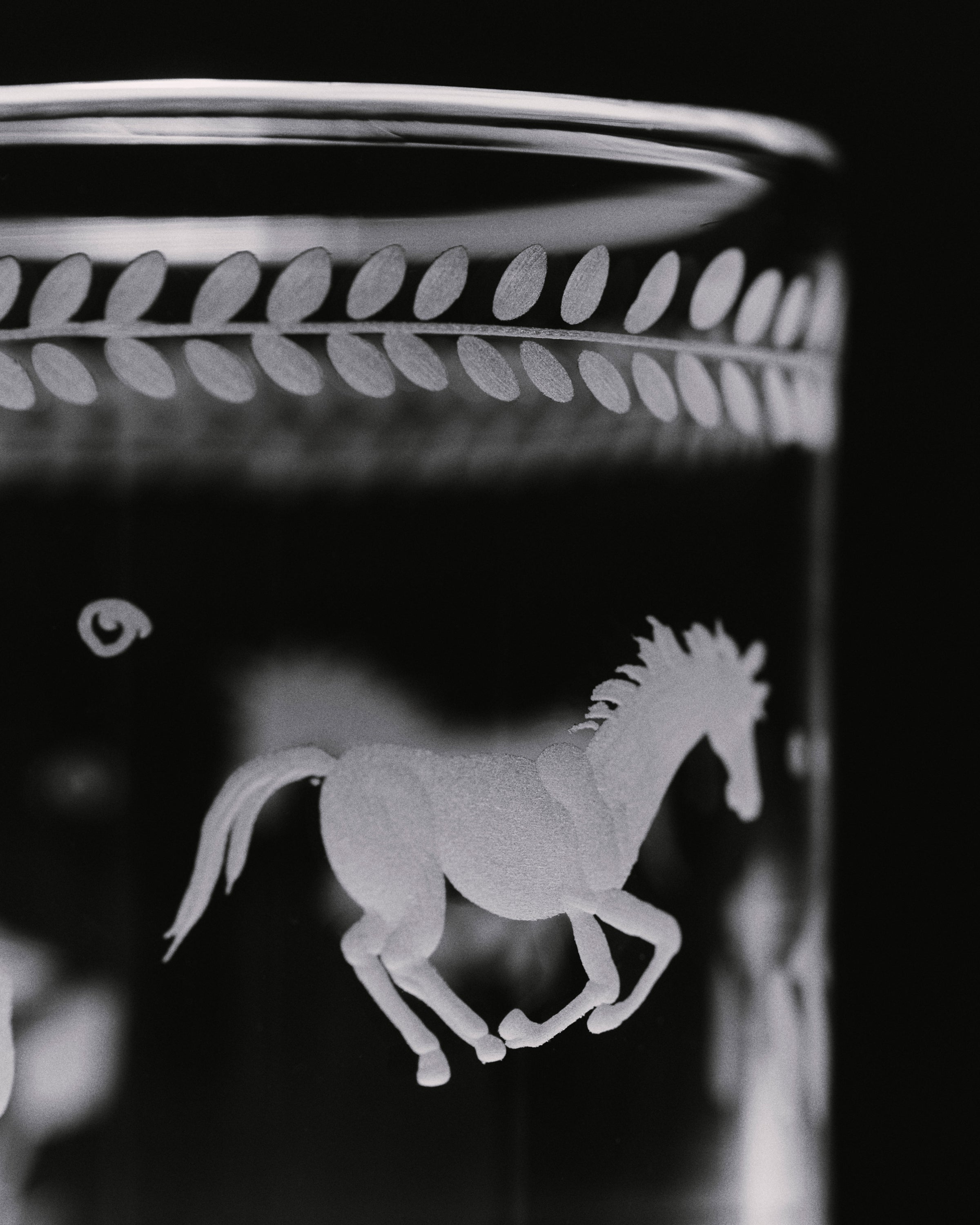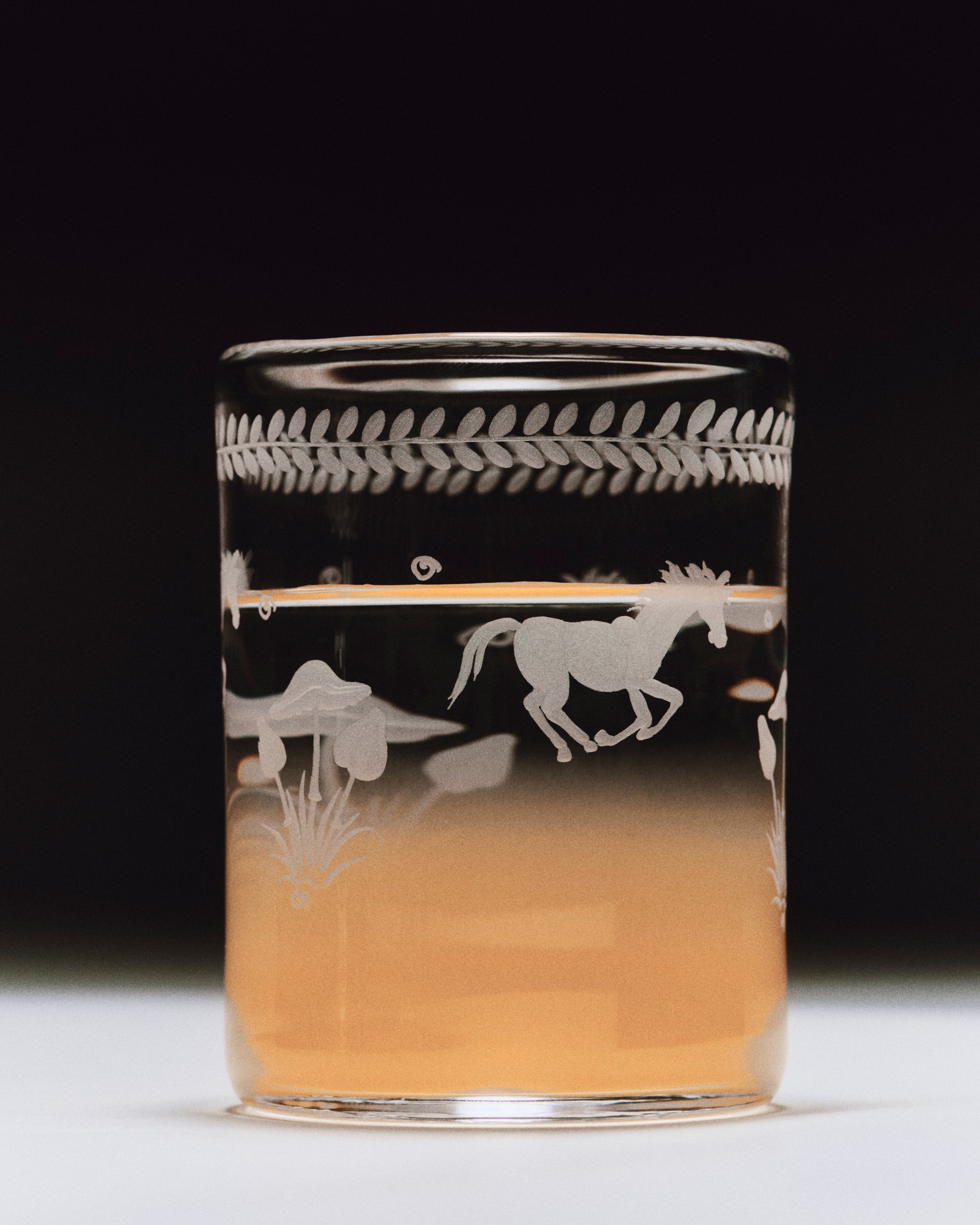 The Barbro glasses celebrate the elegance of the classical souvenir glass while embracing a contemporary design with a squared cup and sculptural stem. Each piece is patiently engraved by the hand of a master, possessing its own poetic character. The motifs are hand-sketched by Akua Objects, reflecting their design philosophy. The bow motif symbolizes unity, enriched with Art Deco inspired engravings, while the playful depictions of mushroom, flowers and horses celebrate the beauty of nature, the freedom of galloping and Annika's horse-filled childhood.